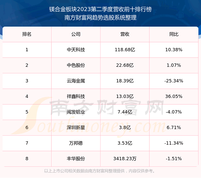 按照趋势选股系统统计,该股所属板块为镁合金板块,该板块共有8只股票,丰华股份2023第二季度营收在该板块中排名为第8名,该板块2023第二季度营收排名前十的股票如下表: