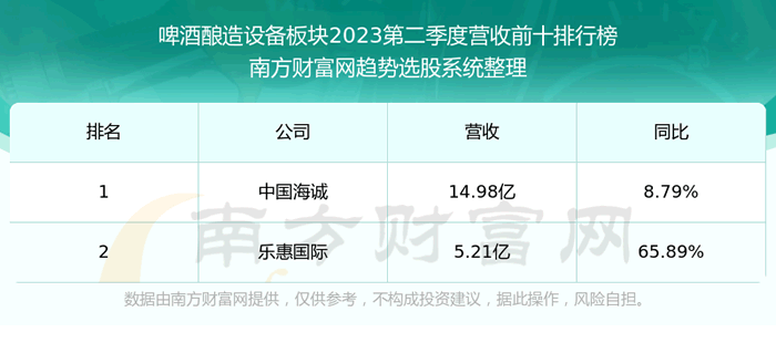 按照趋势选股系统统计,该股所属板块为啤酒酿造设备板块,该板块共有2只股票,乐惠国际2023第二季度营收在该板块中排名为第2名,该板块2023第二季度营收排名前十的股票如下表: