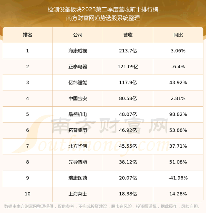 按照趋势选股系统统计,该股所属板块为检测设备板块,该板块共有38只股票,天准科技2023第二季度营收在该板块中排名为第25名,该板块2023第二季度营收排名前十的股票如下表: