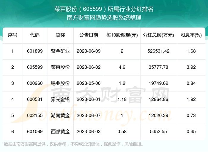 按照趋势选股系统统计,菜百股份所属行业为贵金属行业,贵金属行业分红排名情况如下表: