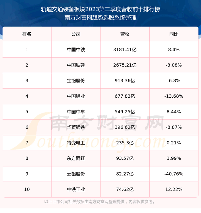 按照趋势选股系统统计,该股所属板块为轨道交通装备板块,该板块共有23只股票,时代电气2023第二季度营收在该板块中排名为第11名,该板块2023第二季度营收排名前十的股票如下表:
