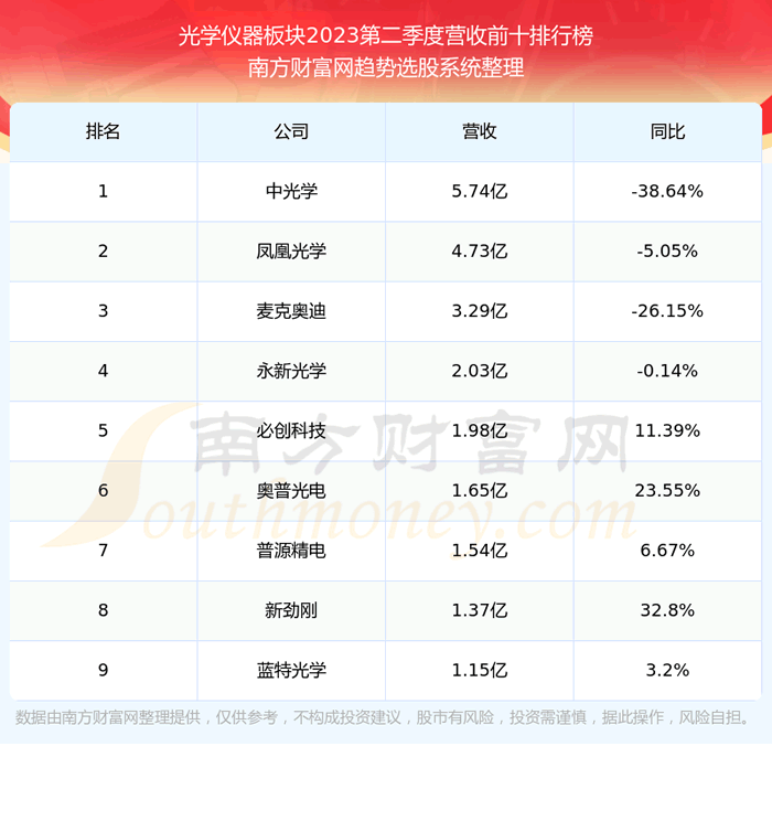 按照趋势选股系统统计,该股所属板块为光学仪器板块,该板块共有9只股票,*ST富吉2023第二季度营收在该板块中排名为第9名,该板块2023第二季度营收排名前十的股票如下表:
