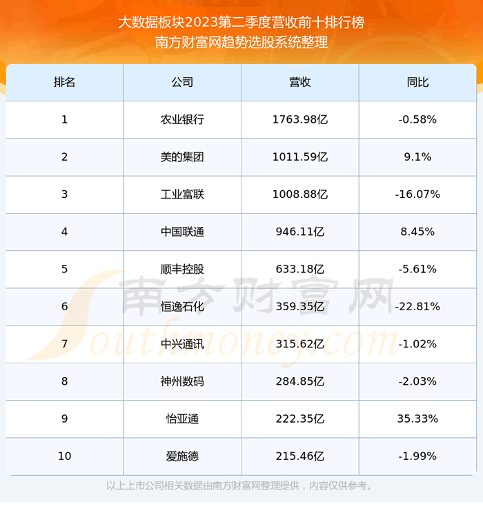 按照趋势选股系统统计,该股所属板块为大数据板块,该板块共有408只股票,三六零2023第二季度营收在该板块中排名为第52名,该板块2023第二季度营收排名前十的股票如下表:
