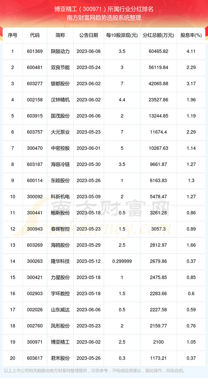 按照趋势选股系统统计,博亚精工所属行业为通用设备行业,通用设备行业分红排名情况如下表:
