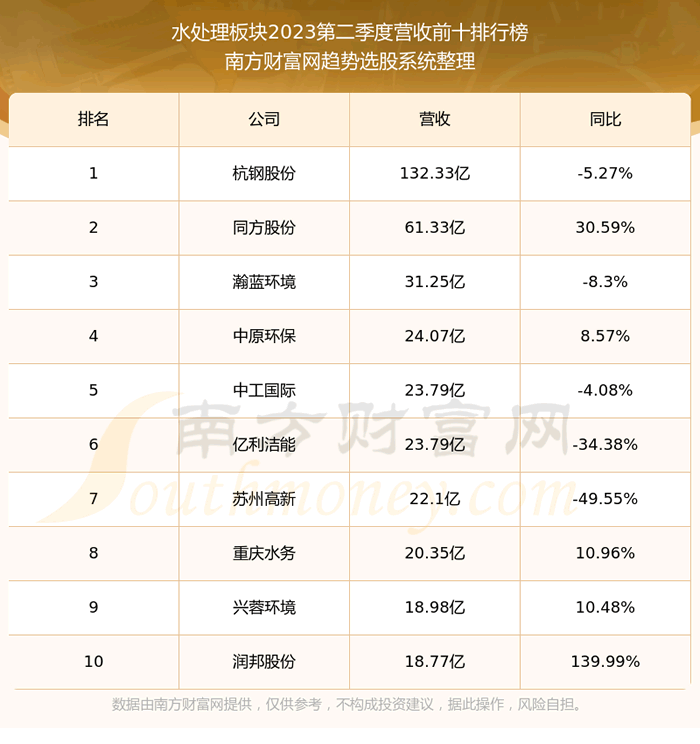 按照趋势选股系统统计,该股所属板块为水处理板块,该板块共有58只股票,金科环境2023第二季度营收在该板块中排名为第47名,该板块2023第二季度营收排名前十的股票如下表: