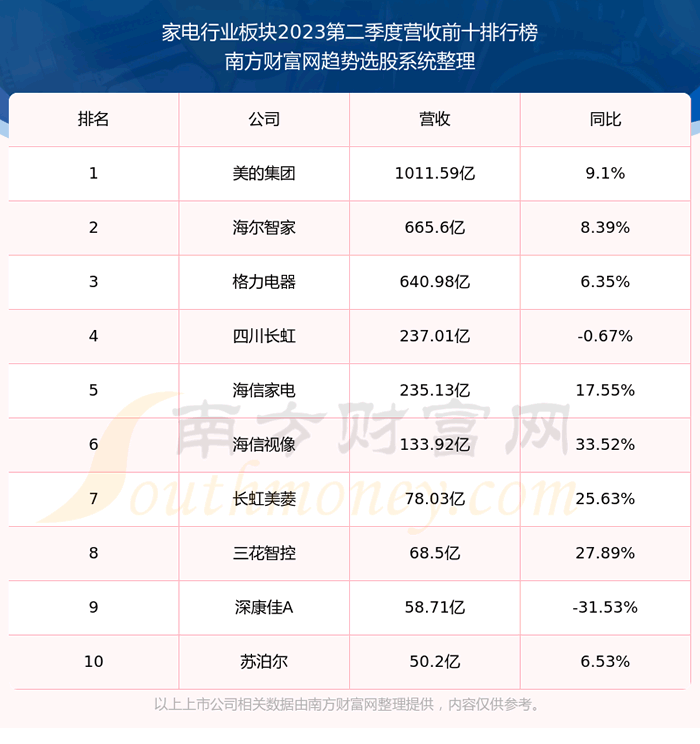 按照趋势选股系统统计,该股所属板块为家电行业板块,该板块共有63只股票,澳柯玛2023第二季度营收在该板块中排名为第18名,该板块2023第二季度营收排名前十的股票如下表: