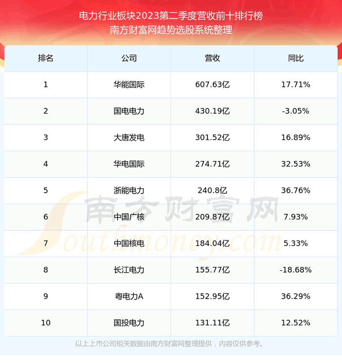 按照趋势选股系统统计,该股所属板块为电力行业板块,该板块共有89只股票,郴电国际2023第二季度营收在该板块中排名为第57名,该板块2023第二季度营收排名前十的股票如下表: