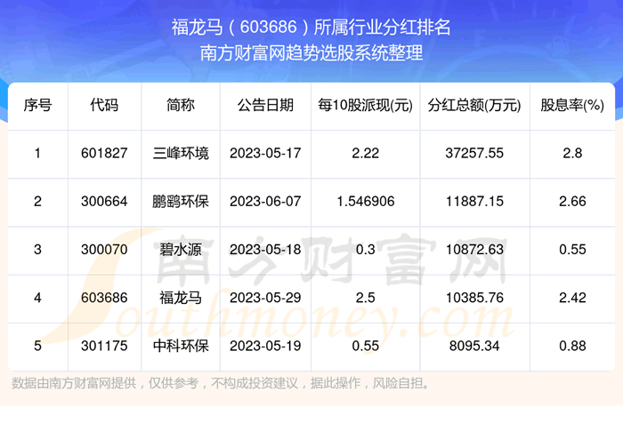 按照趋势选股系统统计,福龙马所属行业为环保行业行业,环保行业行业分红排名情况如下表:
