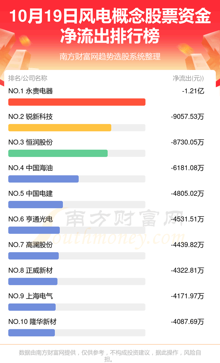 风电概念股票10月19日资金净流出情况来看,永贵电器位列第一位,主力净流出达到-1.21亿元;锐新科技排名第二,主力净流出为-9057.53万元;恒润股份排名第三,主力净流出-8730.05万元。主力净流出排名前10的还有:中国海油、中国电建、亨通光电、高澜股份、正威新材、上海电气、隆华新材。