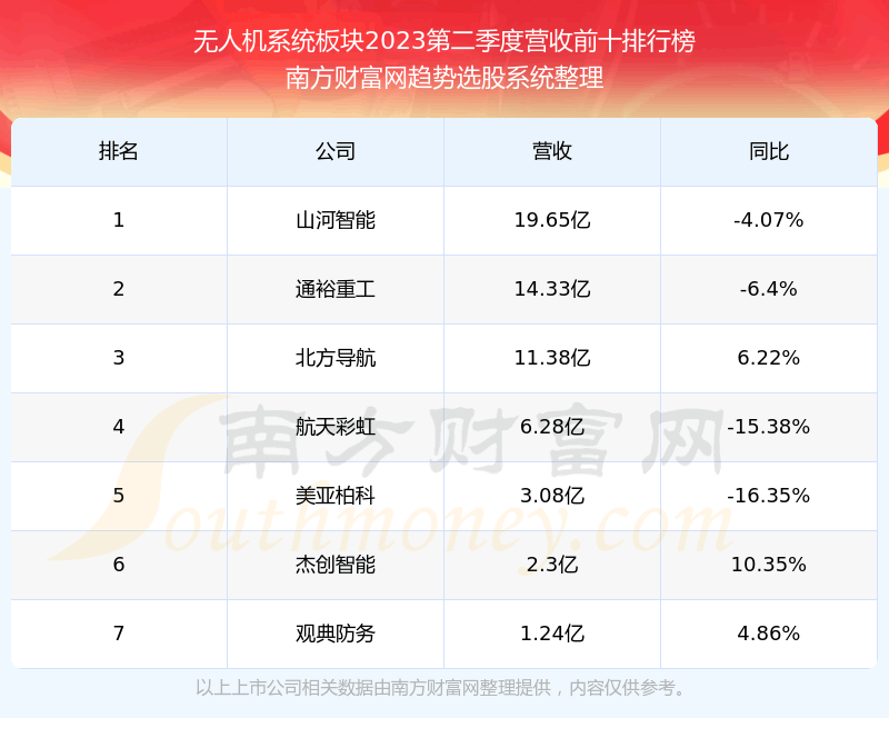 按照趋势选股系统统计,该股所属板块为无人机系统板块,该板块共有7只股票,观典防务2023第二季度营收在该板块中排名为第7名,该板块2023第二季度营收排名前十的股票如下表: