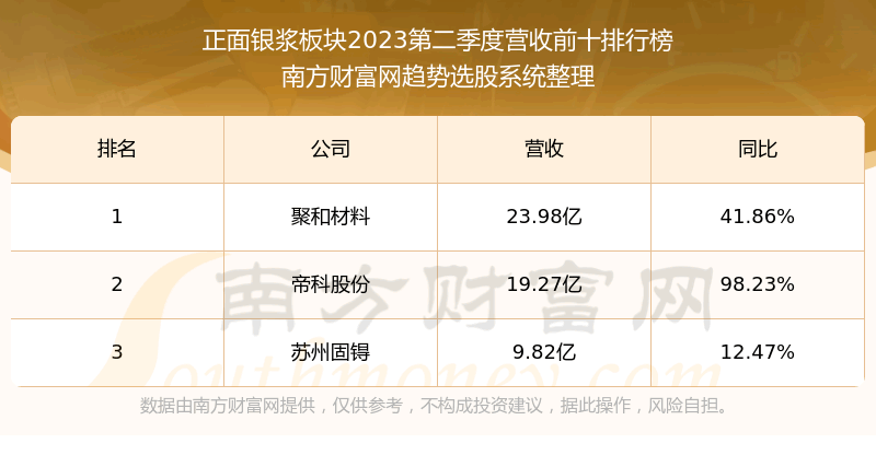 按照趋势选股系统统计,该股所属板块为正面银浆板块,该板块共有3只股票,聚和材料2023第二季度营收在该板块中排名为第1名,该板块2023第二季度营收排名前十的股票如下表: