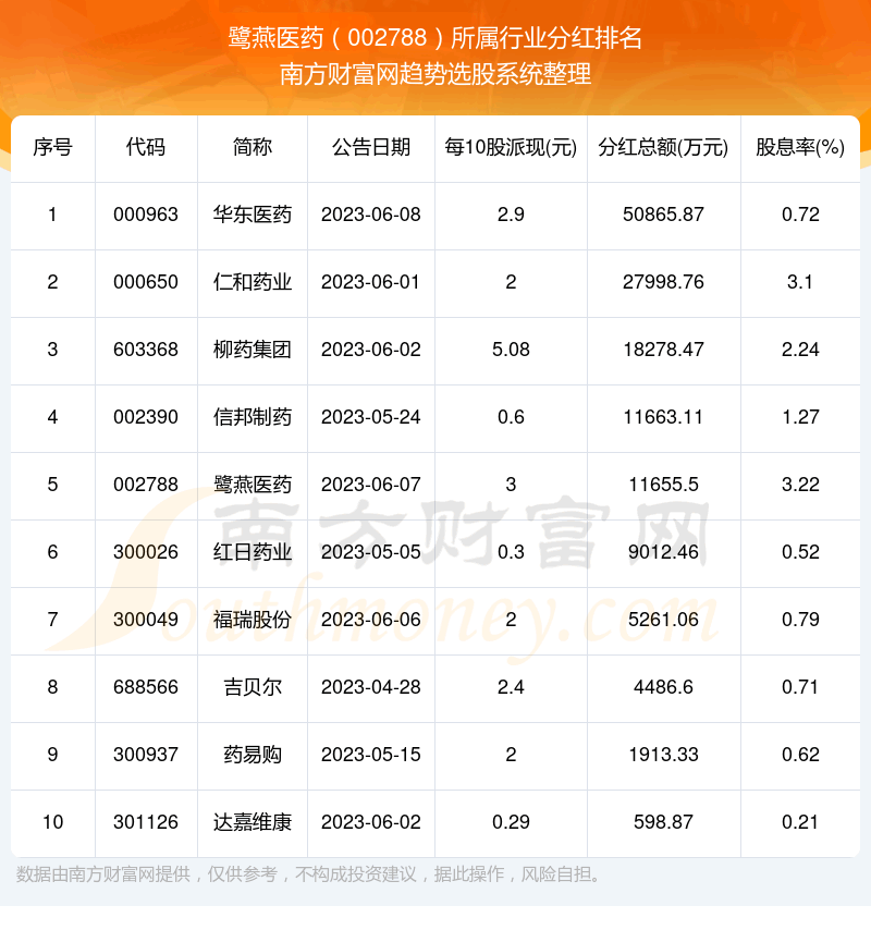 按照趋势选股系统统计,鹭燕医药所属行业为医药商业行业,医药商业行业分红排名情况如下表: