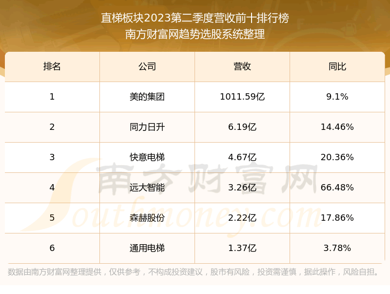 按照趋势选股系统统计,该股所属板块为直梯板块,该板块共有6只股票,梅轮电梯2023第二季度营收在该板块中排名为第6名,该板块2023第二季度营收排名前十的股票如下表:
