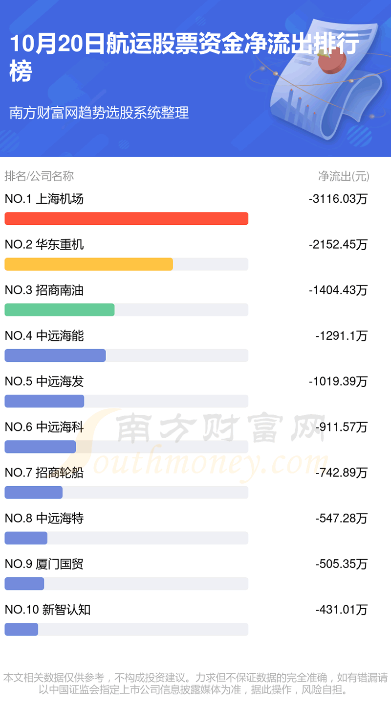 航运股票10月20日资金净流出情况来看,上海机场位列第一位,主力净流出达到-3116.03万元;华东重机排名第二,主力净流出为-2152.45万元;招商南油排名第三,主力净流出-1404.43万元。主力净流出排名前10的还有:中远海能、中远海发、中远海科、招商轮船、中远海特、厦门国贸、新智认知。