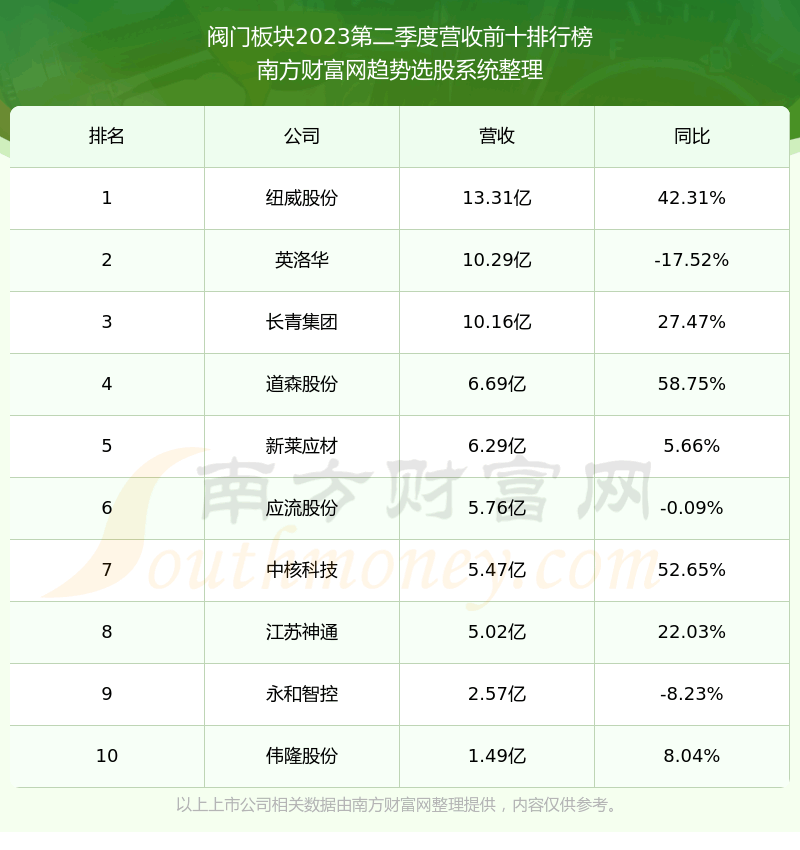 按照趋势选股系统统计,该股所属板块为阀门板块,该板块共有10只股票,应流股份2023第二季度营收在该板块中排名为第6名,该板块2023第二季度营收排名前十的股票如下表: