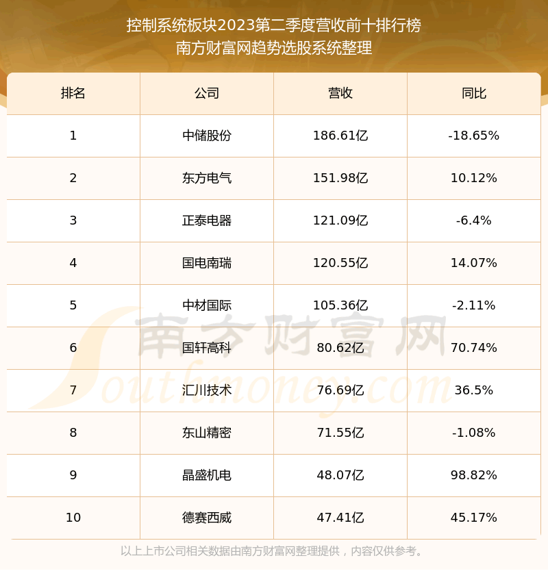按照趋势选股系统统计,该股所属板块为控制系统板块,该板块共有153只股票,天玛智控2023第二季度营收在该板块中排名为第153名,该板块2023第二季度营收排名前十的股票如下表: