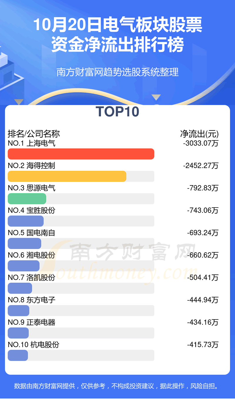 电气板块股票10月20日资金净流出情况来看,上海电气位列第一位,主力净流出达到-3033.07万元;海得控制排名第二,主力净流出为-2452.27万元;思源电气排名第三,主力净流出-792.83万元。主力净流出排名前10的还有:宝胜股份、国电南自、湘电股份、洛凯股份、东方电子、正泰电器、杭电股份。