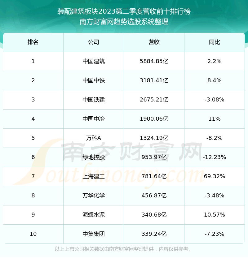按照趋势选股系统统计,该股所属板块为装配建筑板块,该板块共有92只股票,宁波建工2023第二季度营收在该板块中排名为第25名,该板块2023第二季度营收排名前十的股票如下表: