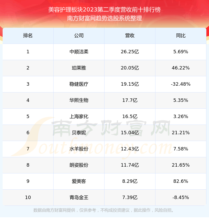 按照趋势选股系统统计,该股所属板块为美容护理板块,该板块共有33只股票,倍加洁2023第二季度营收在该板块中排名为第25名,该板块2023第二季度营收排名前十的股票如下表: