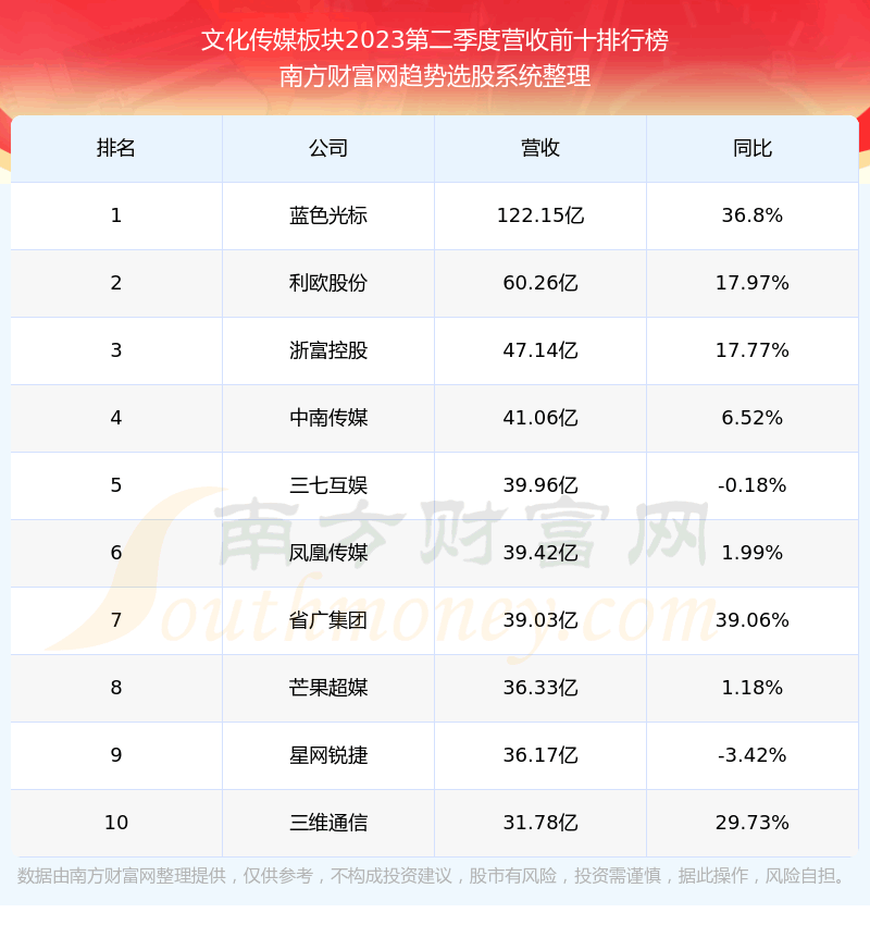 按照趋势选股系统统计,该股所属板块为文化传媒板块,该板块共有250只股票,凤凰传媒2023第二季度营收在该板块中排名为第6名,该板块2023第二季度营收排名前十的股票如下表: