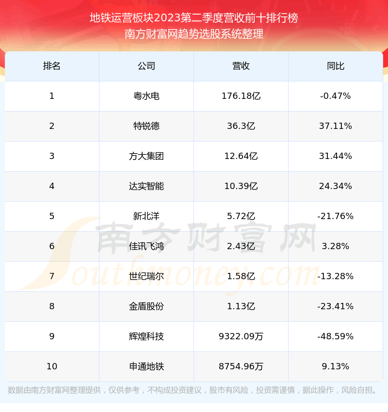 按照趋势选股系统统计,该股所属板块为地铁运营板块,该板块共有11只股票,申通地铁2023第二季度营收在该板块中排名为第10名,该板块2023第二季度营收排名前十的股票如下表:
