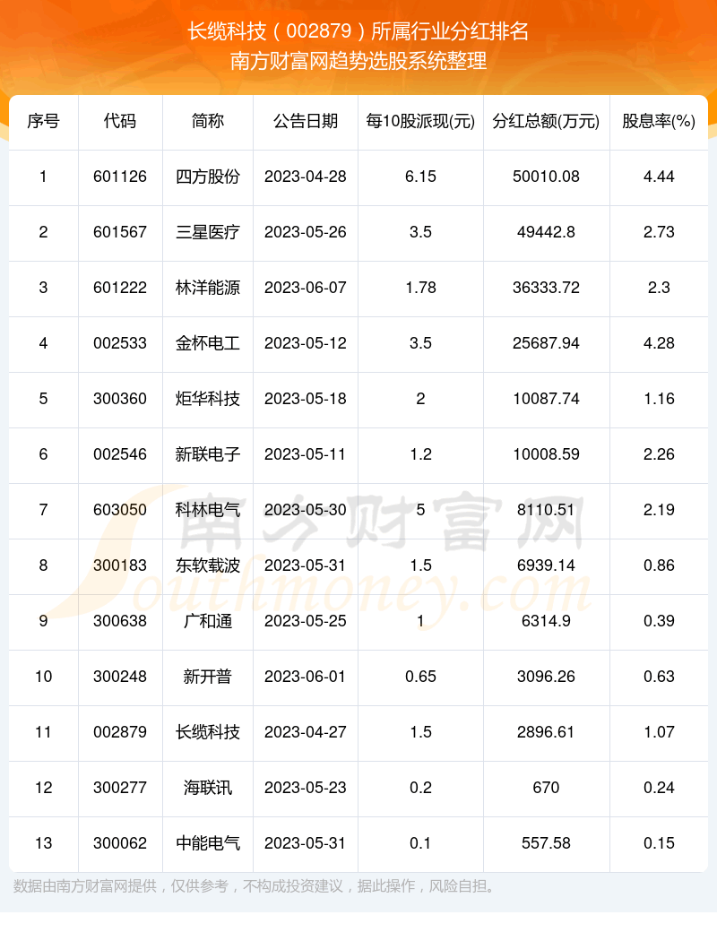 按照趋势选股系统统计,长缆科技所属行业为电网设备行业,电网设备行业分红排名情况如下表: