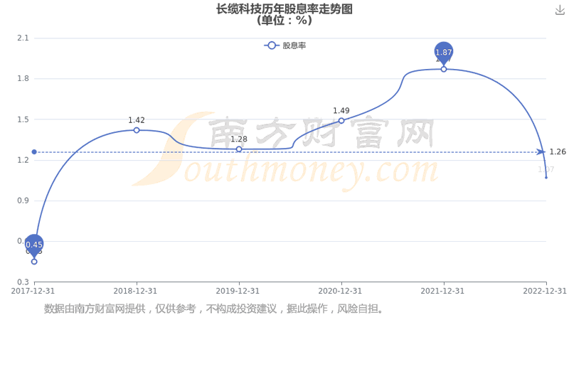 长缆科技最新一次公布的分红方案为10派1.5元。本次权益分派股权登记日为2023年5月5日,除权除息日为2023年5月8日,派息日为2023年5月8日。