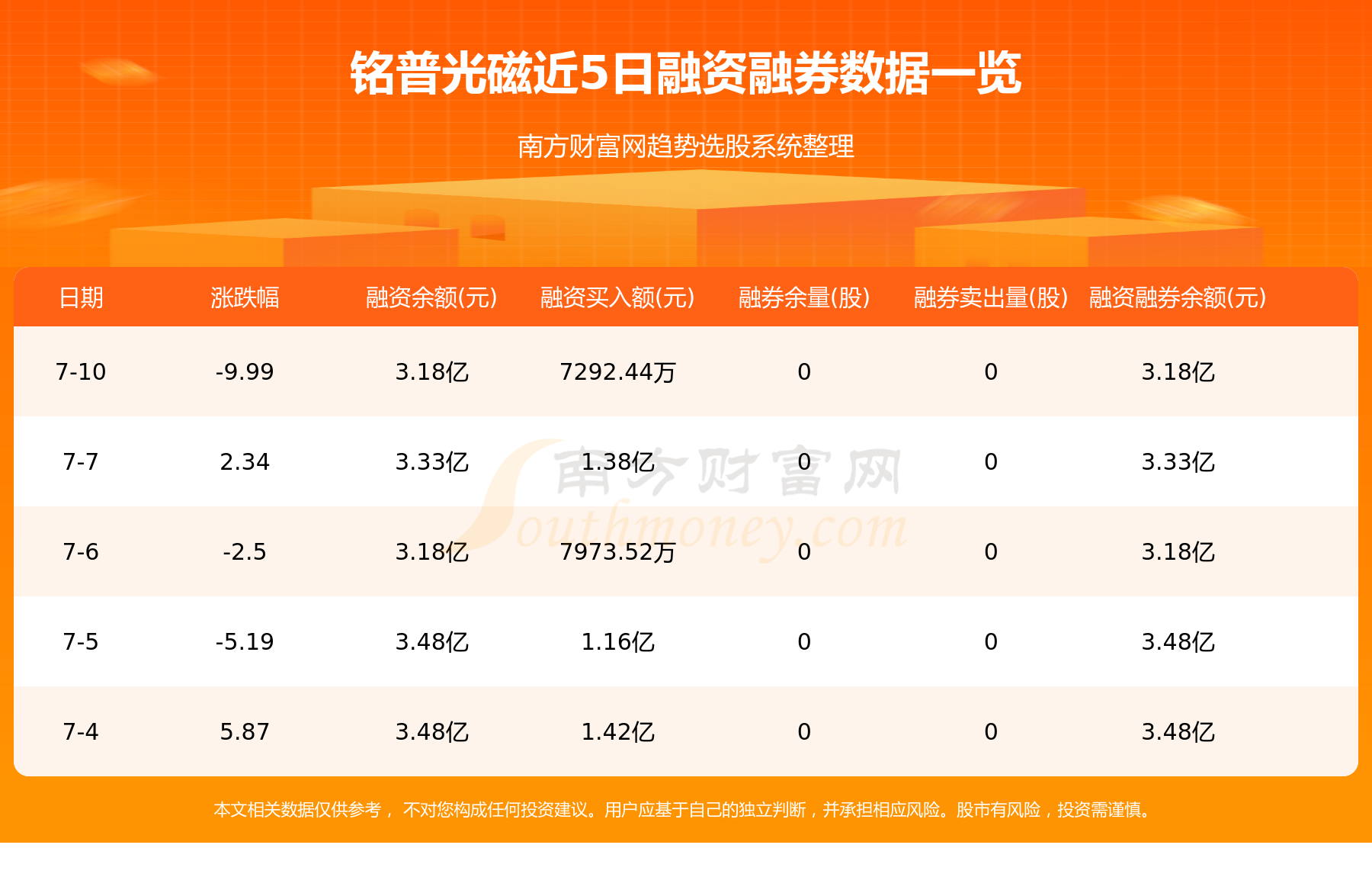 铭普光磁7月10日融券信息显示,融资方面,当日融资买入7292.44万元,融资偿还8767.5万元,融资净买额-1475.06万元。近5日融资融券数据一览见下表: