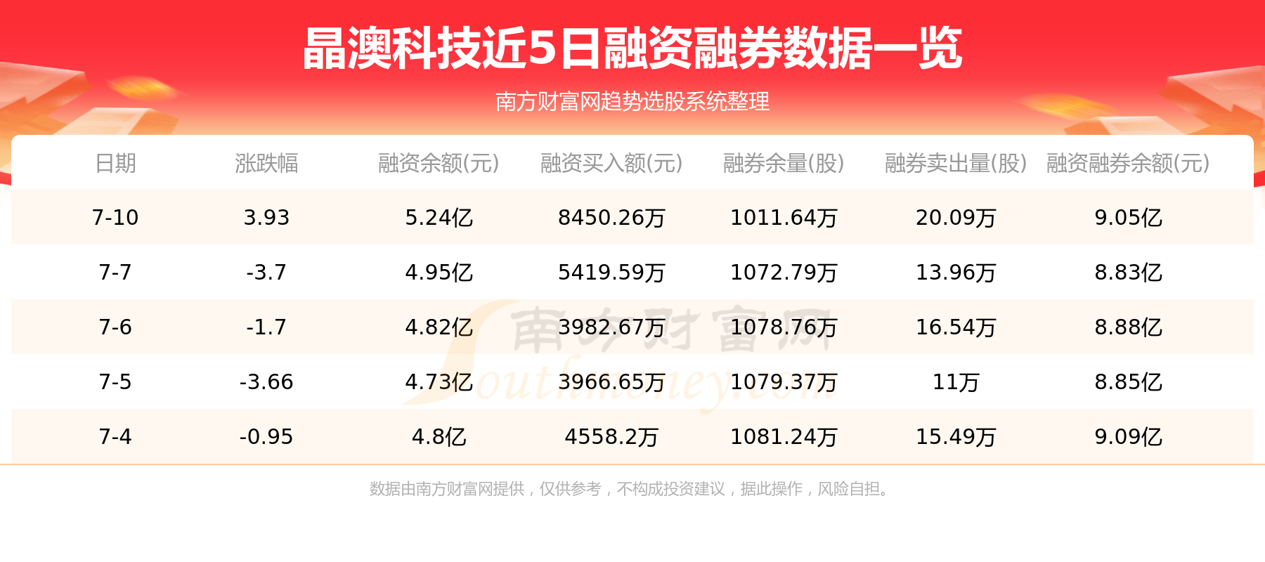 7月10日晶澳科技融券信息显示,融资方面,当日融资买入8450.26万元,融资偿还5555.26万元,融资净买额2894.99万元。融券方面,融券卖出20.09万股,融券偿还81.24万股,融券余量1011.64万股,融券余额3.8亿元。融资融券余额9.05亿元。