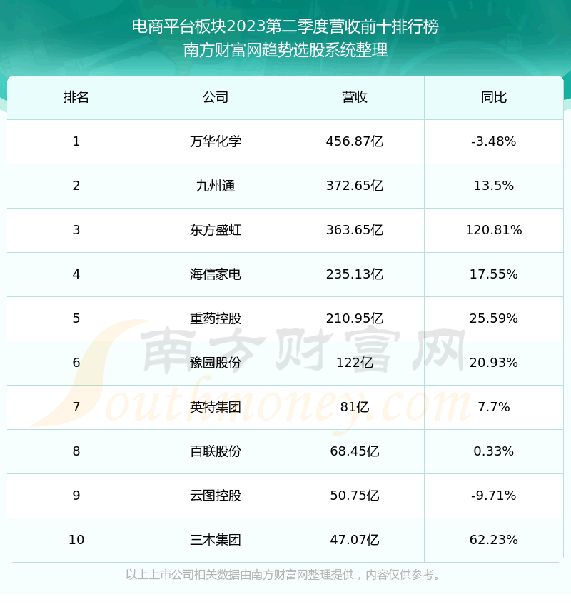 按照趋势选股系统统计,该股所属板块为电商平台板块,该板块共有41只股票,白云山2023第二季度营收在该板块中排名为第41名,该板块2023第二季度营收排名前十的股票如下表: