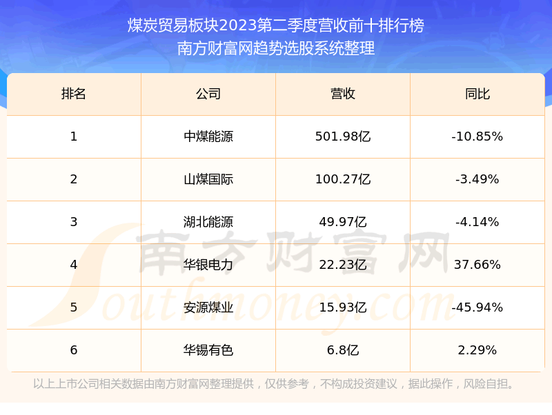 按照趋势选股系统统计,该股所属板块为煤炭贸易板块,该板块共有6只股票,杭州热电2023第二季度营收在该板块中排名为第6名,该板块2023第二季度营收排名前十的股票如下表: