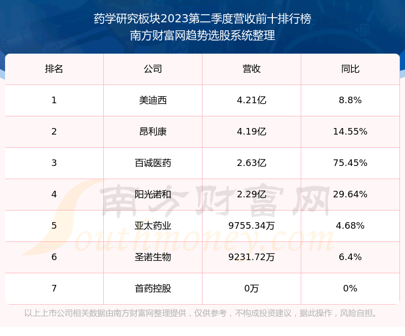 按照趋势选股系统统计,该股所属板块为药学研究板块,该板块共有7只股票,美迪西2023第二季度营收在该板块中排名为第1名,该板块2023第二季度营收排名前十的股票如下表: