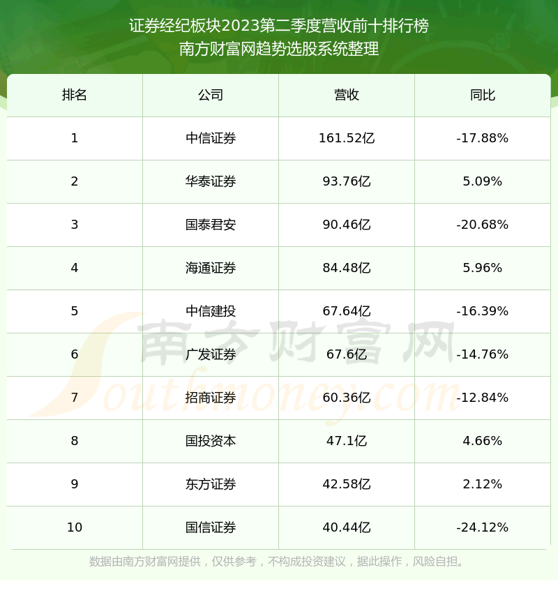 按照趋势选股系统统计,该股所属板块为证券经纪板块,该板块共有36只股票,西南证券2023第二季度营收在该板块中排名为第36名,该板块2023第二季度营收排名前十的股票如下表: