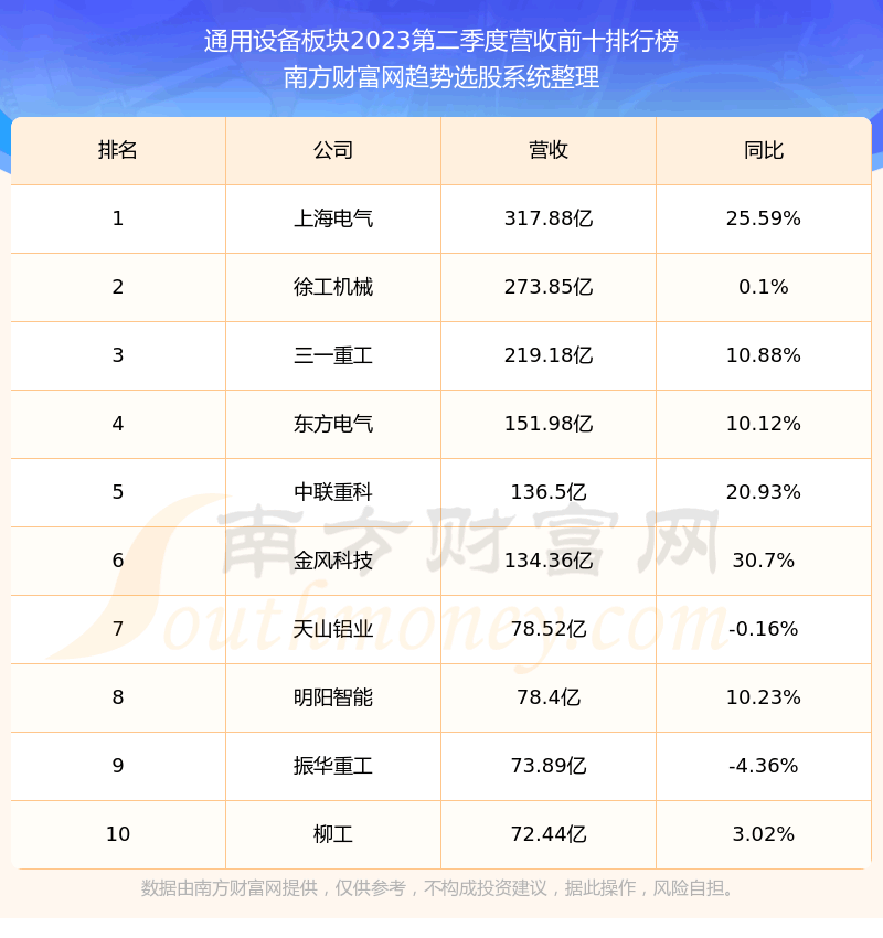 按照趋势选股系统统计,该股所属板块为通用设备板块,该板块共有348只股票,贵绳股份2023第二季度营收在该板块中排名为第111名,该板块2023第二季度营收排名前十的股票如下表: