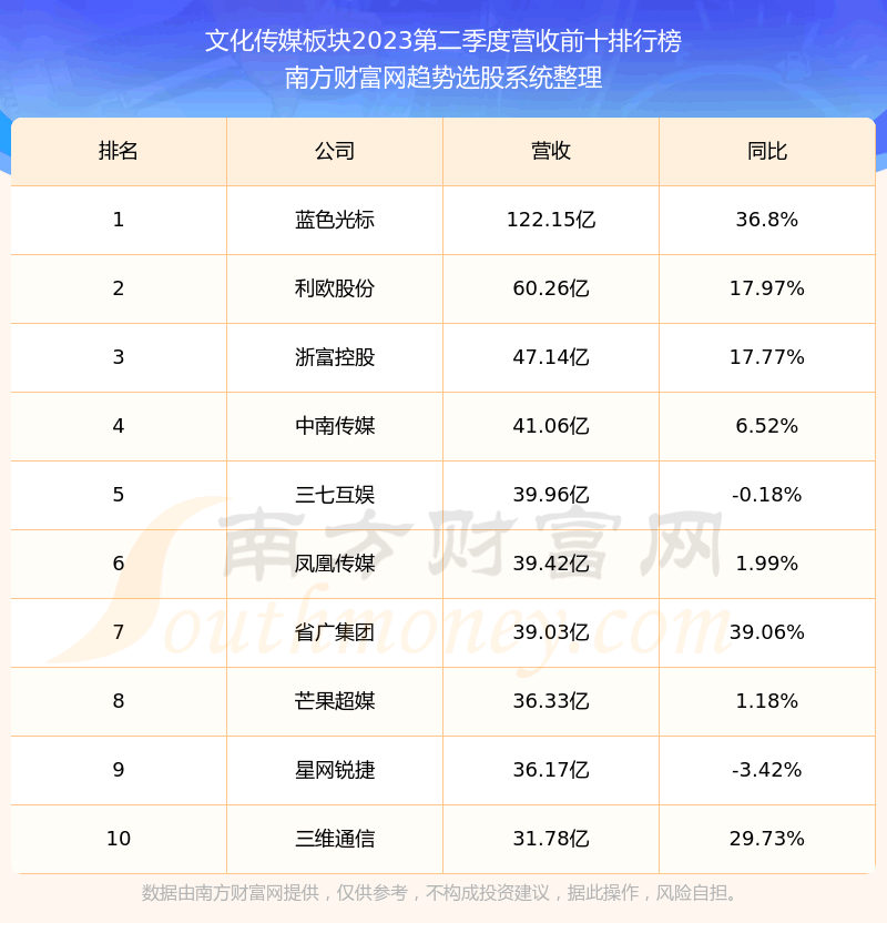 按照趋势选股系统统计,该股所属板块为文化传媒板块,该板块共有250只股票,吉视传媒2023第二季度营收在该板块中排名为第118名,该板块2023第二季度营收排名前十的股票如下表: