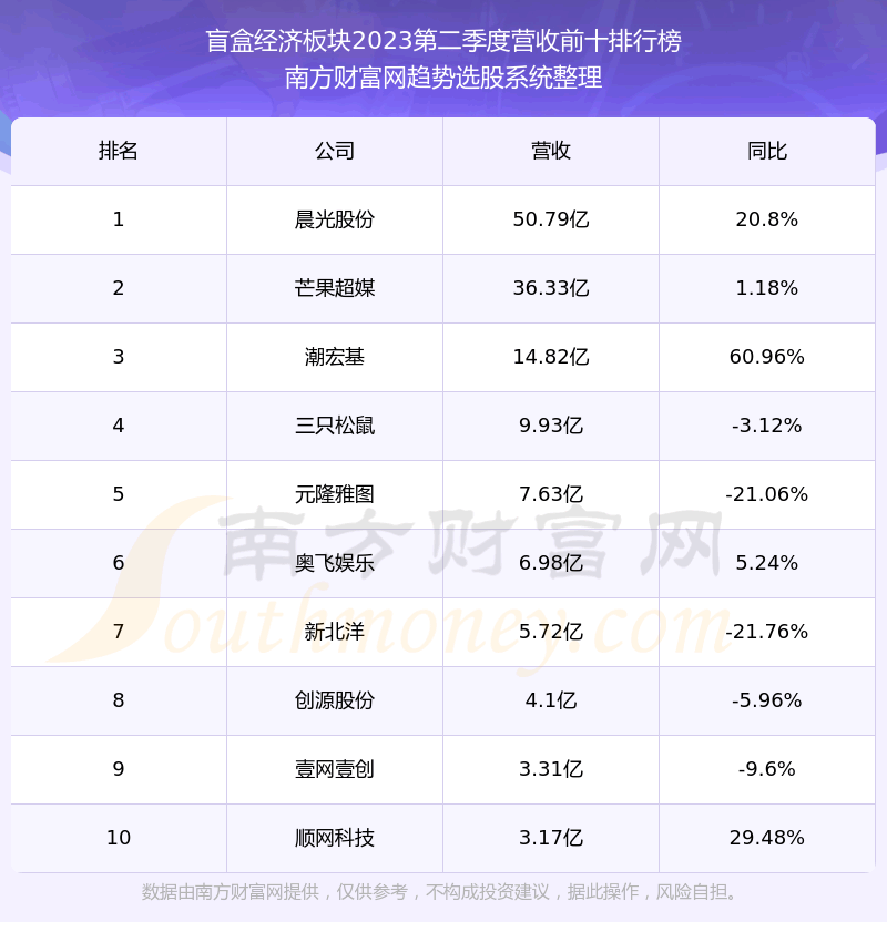 按照趋势选股系统统计,该股所属板块为盲盒经济板块,该板块共有14只股票,沐邦高科2023第二季度营收在该板块中排名为第11名,该板块2023第二季度营收排名前十的股票如下表: