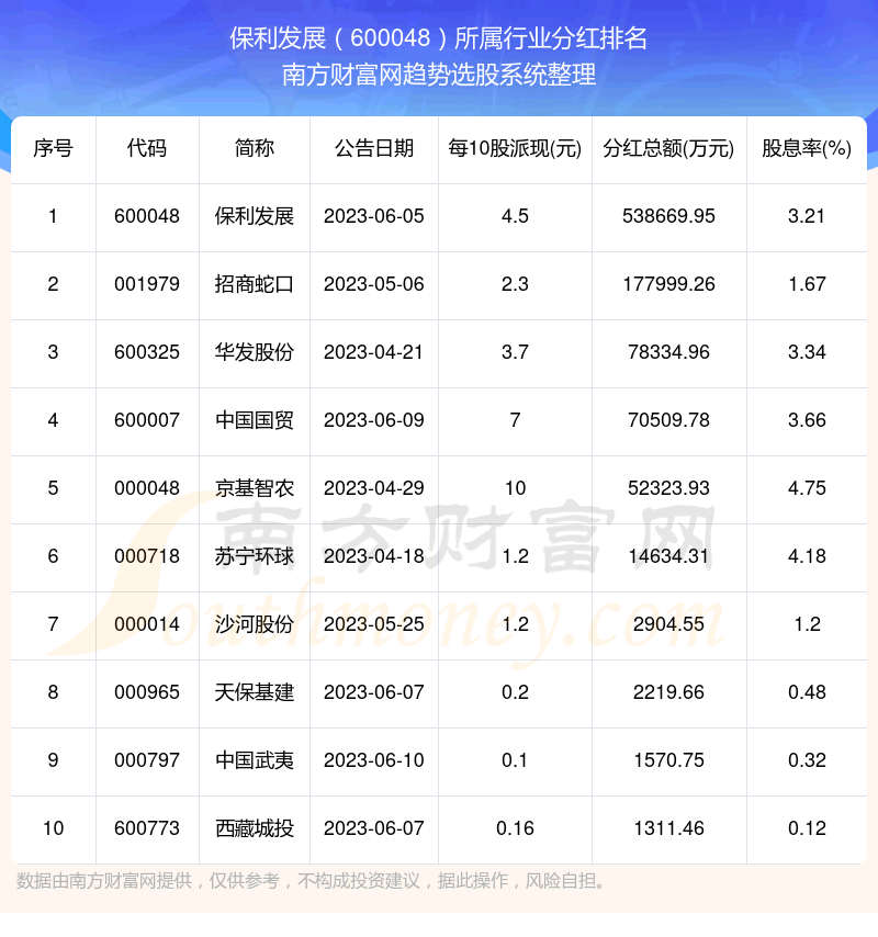 按照趋势选股系统统计,保利发展所属行业为房地产开发行业,房地产开发行业分红排名情况如下表: