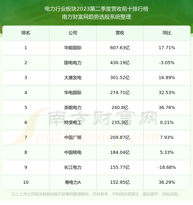 按照趋势选股系统统计,该股所属板块为电力行业板块,该板块共有90只股票,郴电国际2023第二季度营收在该板块中排名为第58名,该板块2023第二季度营收排名前十的股票如下表: