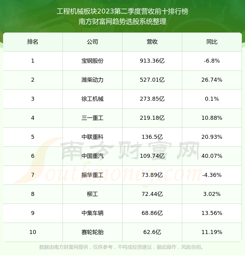 按照趋势选股系统统计,该股所属板块为工程机械板块,该板块共有63只股票,厦工股份2023第二季度营收在该板块中排名为第54名,该板块2023第二季度营收排名前十的股票如下表: