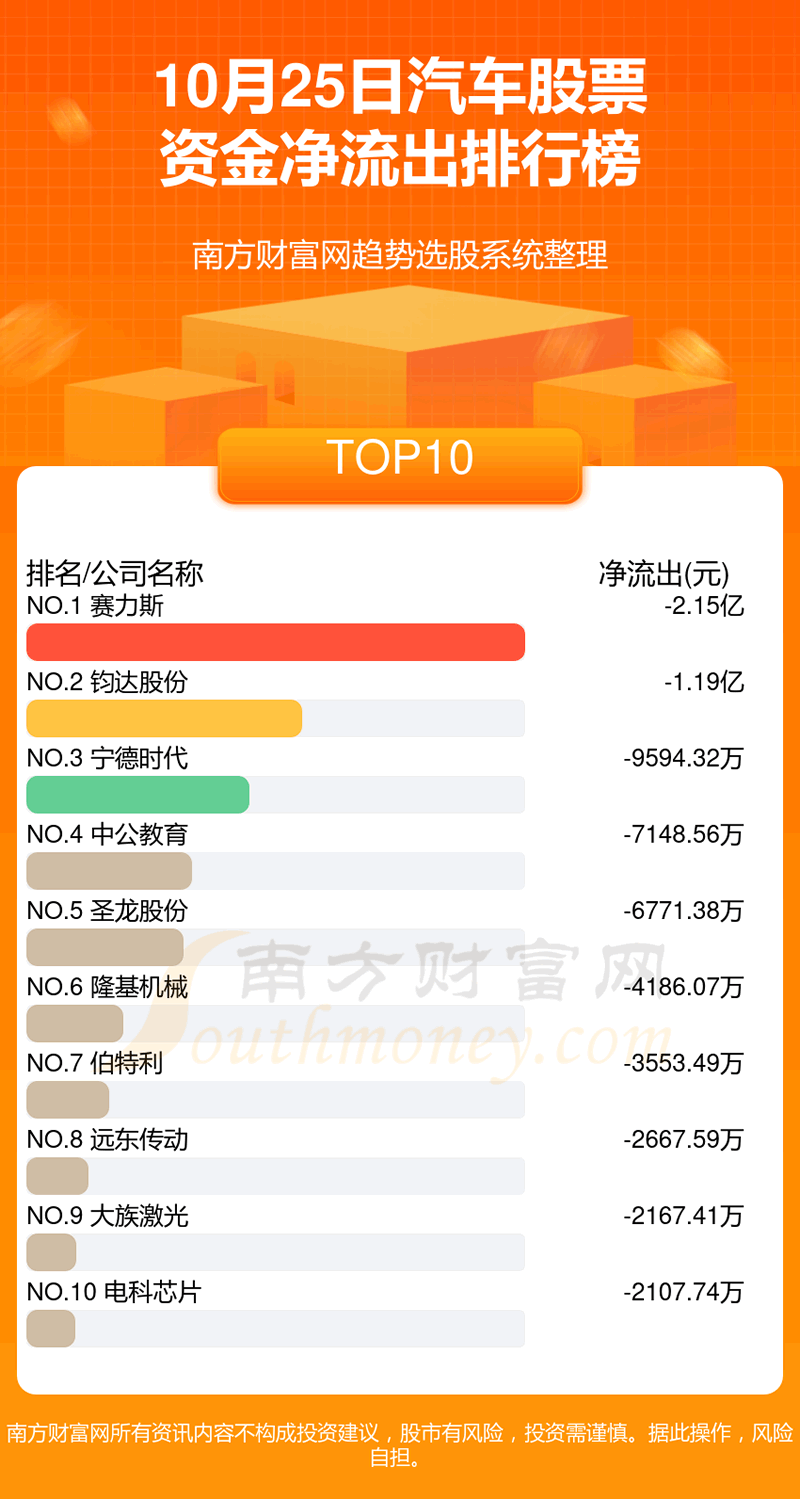 汽车股票10月25日资金净流出情况来看,赛力斯位列第一位,主力净流出达到-2.15亿元;钧达股份排名第二,主力净流出为-1.19亿元;宁德时代排名第三,主力净流出-9594.32万元。主力净流出排名前10的还有:中公教育、圣龙股份、隆基机械、伯特利、远东传动、大族激光、电科芯片。