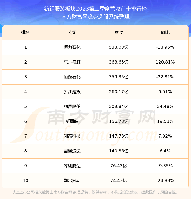 按照趋势选股系统统计,该股所属板块为纺织服装板块,该板块共有176只股票,歌力思2023第二季度营收在该板块中排名为第71名,该板块2023第二季度营收排名前十的股票如下表: