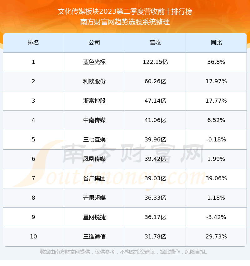 按照趋势选股系统统计,该股所属板块为文化传媒板块,该板块共有250只股票,凤凰传媒2023第二季度营收在该板块中排名为第6名,该板块2023第二季度营收排名前十的股票如下表: