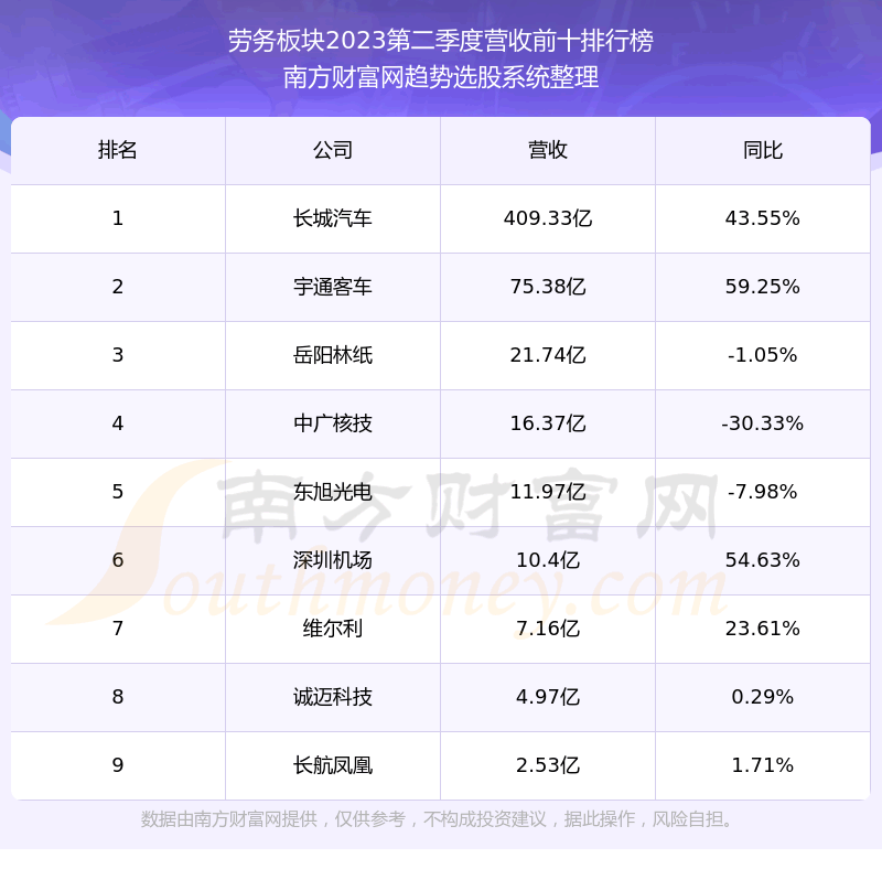 按照趋势选股系统统计,该股所属板块为劳务板块,该板块共有9只股票,迈威生物2023第二季度营收在该板块中排名为第9名,该板块2023第二季度营收排名前十的股票如下表: