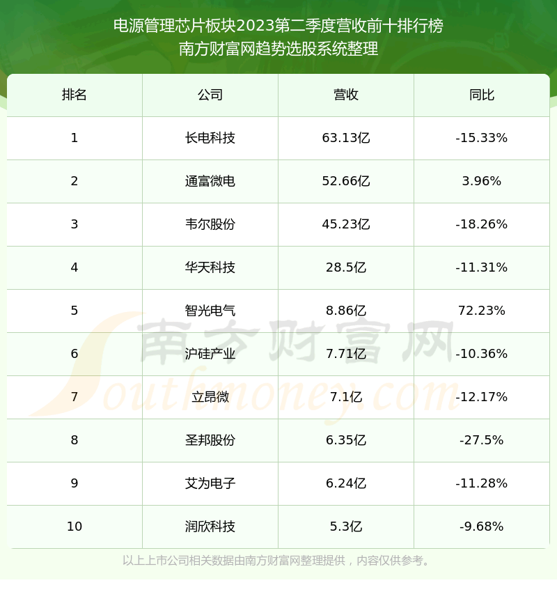 按照趋势选股系统统计,该股所属板块为电源管理芯片板块,该板块共有26只股票,臻镭科技2023第二季度营收在该板块中排名为第26名,该板块2023第二季度营收排名前十的股票如下表: