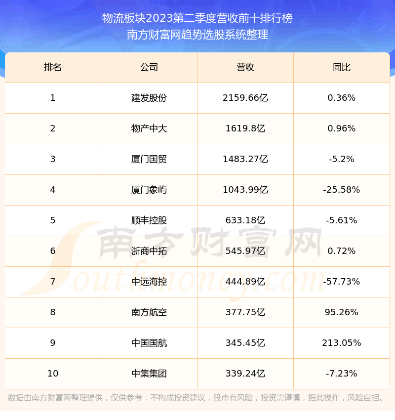 按照趋势选股系统统计,该股所属板块为物流板块,该板块共有77只股票,铁龙物流2023第二季度营收在该板块中排名为第34名,该板块2023第二季度营收排名前十的股票如下表: