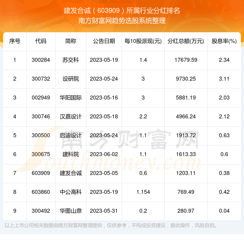 按照趋势选股系统统计,建发合诚所属行业为工程咨询服务行业,工程咨询服务行业分红排名情况如下表: