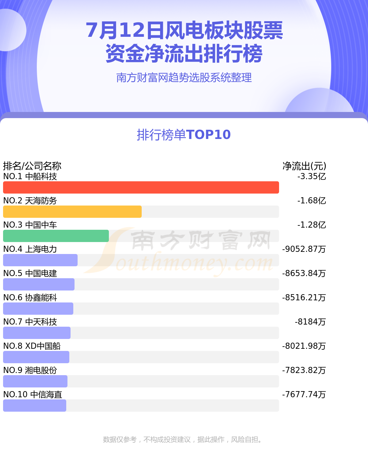 风电板块股票7月12日资金净流出情况来看,中船科技位列第一位,主力净流出达到-3.35亿元;天海防务排名第二,主力净流出为-1.68亿元;中国中车排名第三,主力净流出-1.28亿元。主力净流出排名前10的还有:上海电力、中国电建、协鑫能科、中天科技、中国船舶、湘电股份、中信海直。