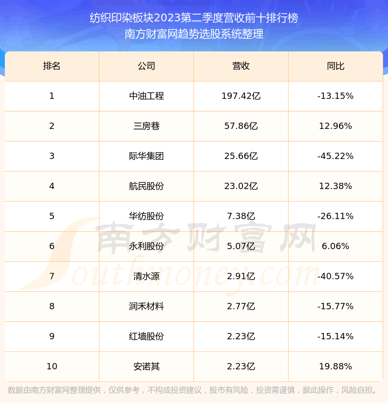 按照趋势选股系统统计,该股所属板块为纺织印染板块,该板块共有13只股票,航民股份2023第二季度营收在该板块中排名为第4名,该板块2023第二季度营收排名前十的股票如下表: