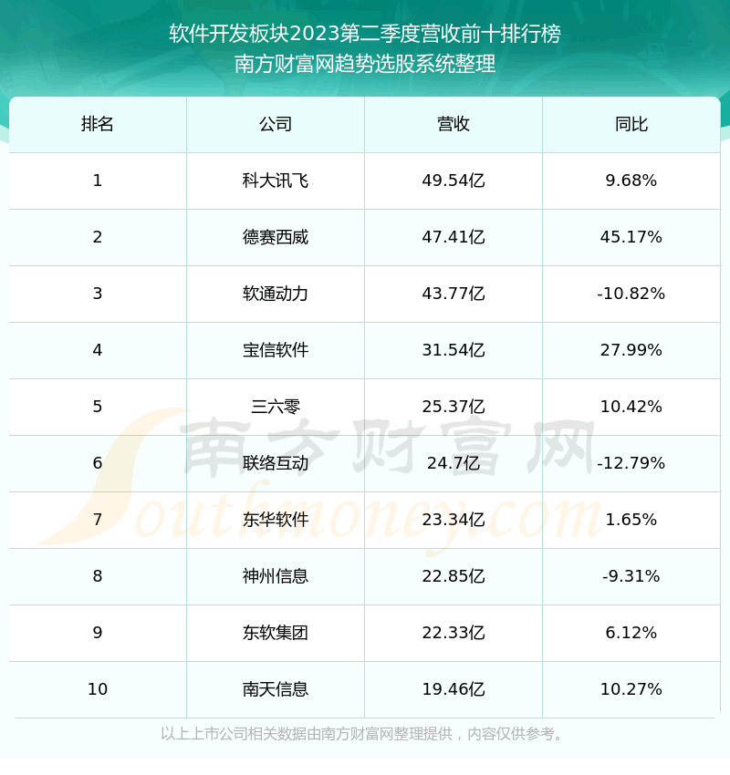 按照趋势选股系统统计,该股所属板块为软件开发板块,该板块共有192只股票,南威软件2023第二季度营收在该板块中排名为第86名,该板块2023第二季度营收排名前十的股票如下表:
