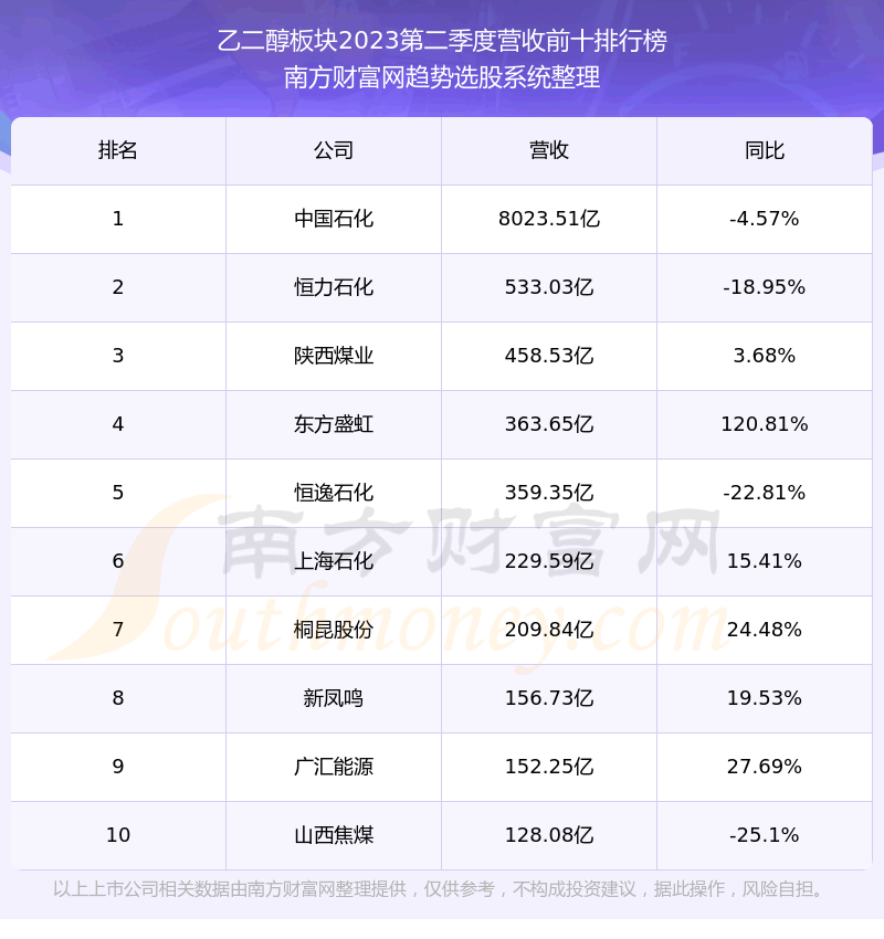 按照趋势选股系统统计,该股所属板块为乙二醇板块,该板块共有33只股票,丹化科技2023第二季度营收在该板块中排名为第27名,该板块2023第二季度营收排名前十的股票如下表: